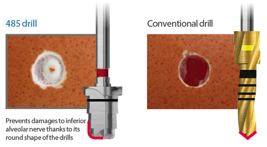 The tip of 485 drills are round, therefore not damaging the inferior alveolar nerve