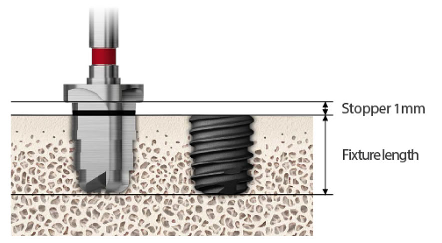 • safe drilling for short implants is possible thanks to the stoppers (1mm extra room minimizes interference of surrounding bone)