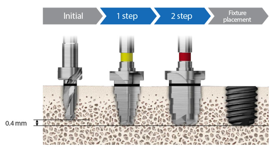 Less Chair time thanks to SIMPLE DRILLING SEQUENCE. 2 Time drilling is enough in normal bone and hard bone