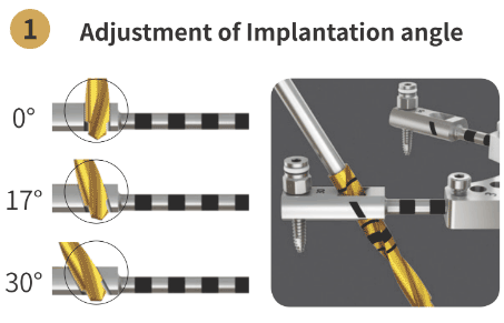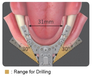 • Implants can be placed in the desired position without damaging the alveolar nerve as a result of the Kit that allows adjustment of the implantation angle, buccal/lingual angulation and distance between the implants